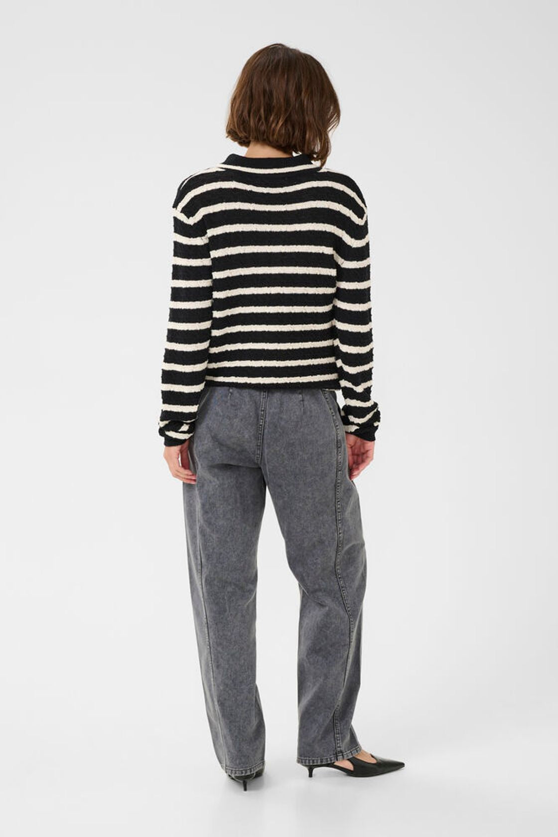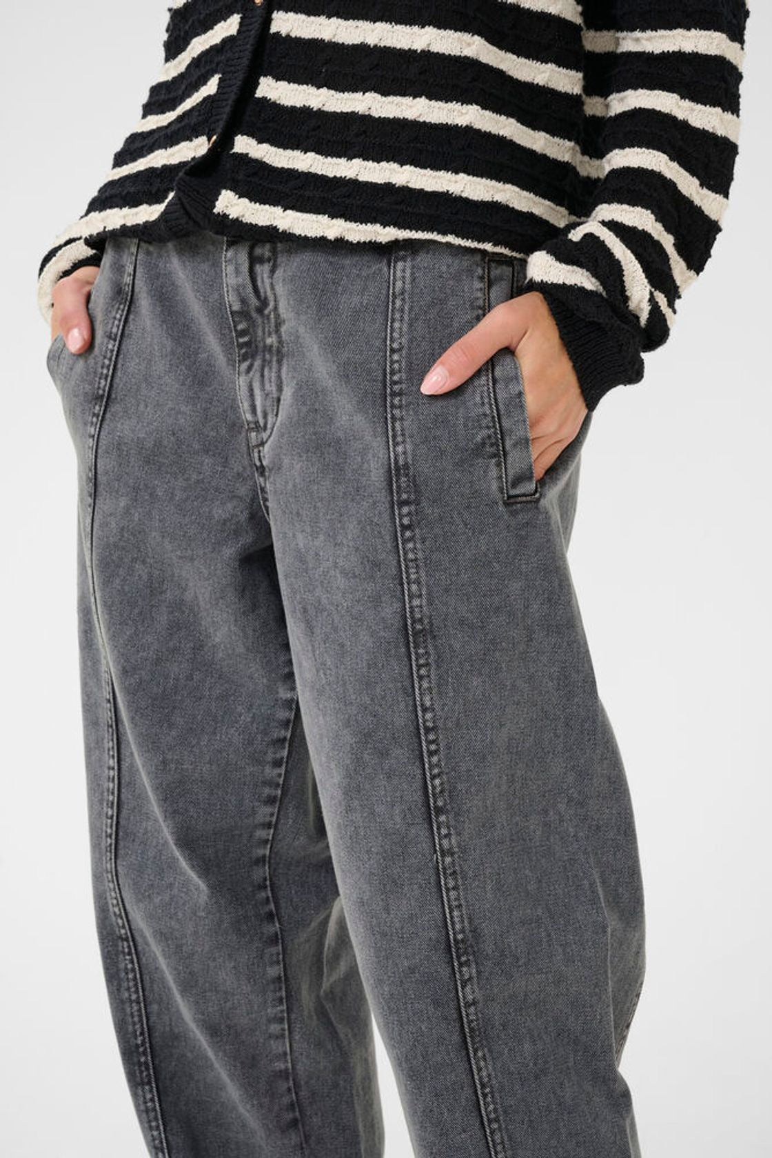 Ankle length carrot cut jeans in faded black denim ( matching jacket available) . Look amazing with a gladiator style sandle.